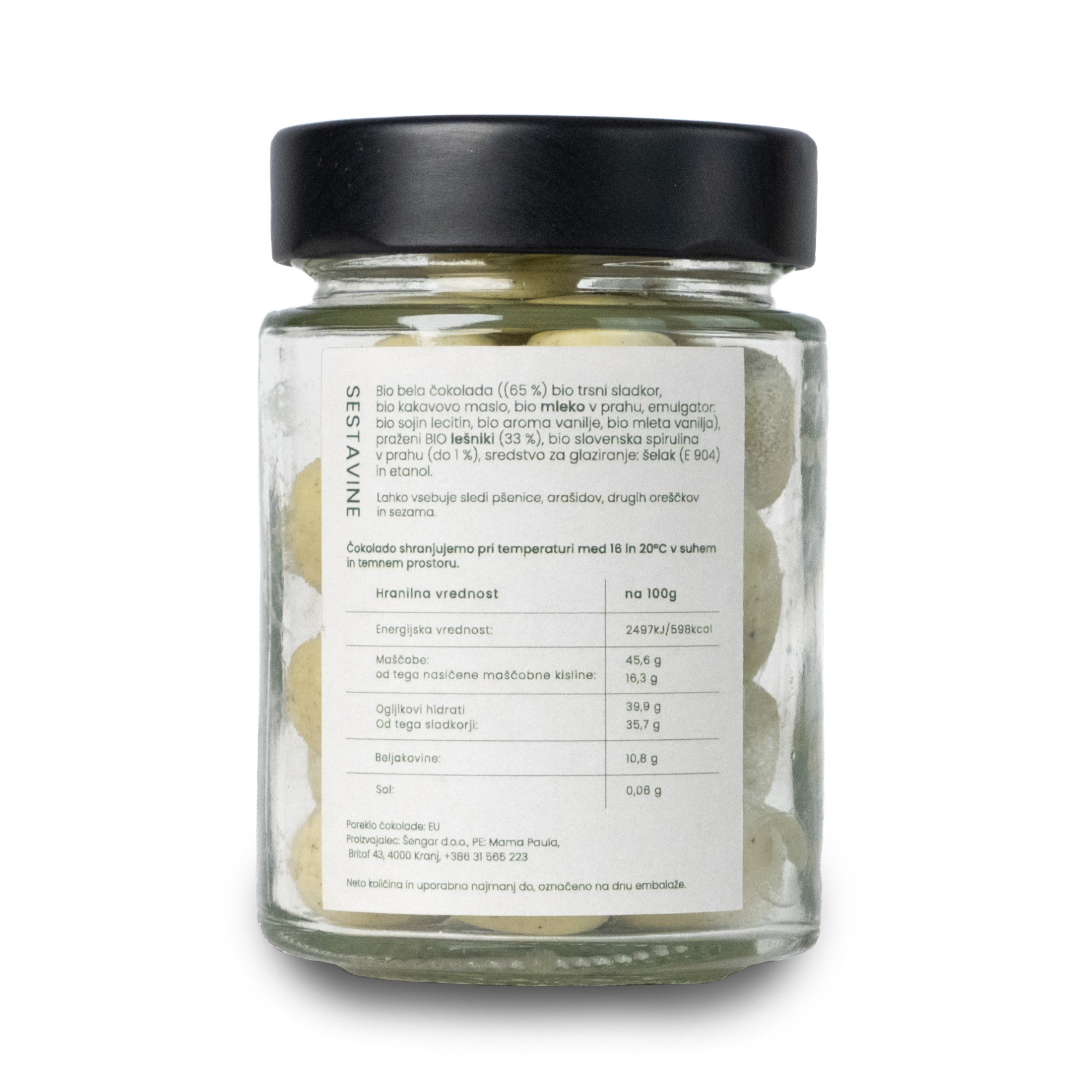 Bela čokolada ((65 %) trsni sladkor, kakavovo maslo, mleko v prahu, emulgator: sojin lecitin, aroma vanilje, mleta vanilja), praženi lešniki (33 %), slovenska spirulina v prahu, sredstvo za glaziranje: šelak (E 904) in etanol.